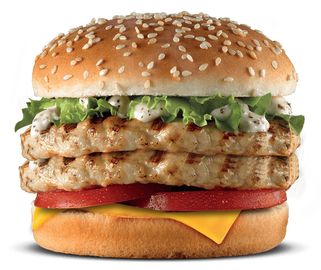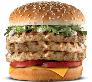 Three delicious chicken breast patties grilled to perfection served with BBQ sauce, melted cheddar cheese and fresh crunchy lettuce on a toasted sesame brioche bun.