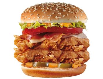 Two delicious chicken breast patties fried to perfection served with hot sauce, bacon, jalapeño and fresh crunchy lettuce on a toasted sesame brioche bun.