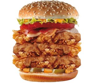 Three delicious chicken breast patties fried to perfection served with hot sauce, bacon, jalapeño and fresh crunchy lettuce on a toasted sesame brioche bun.